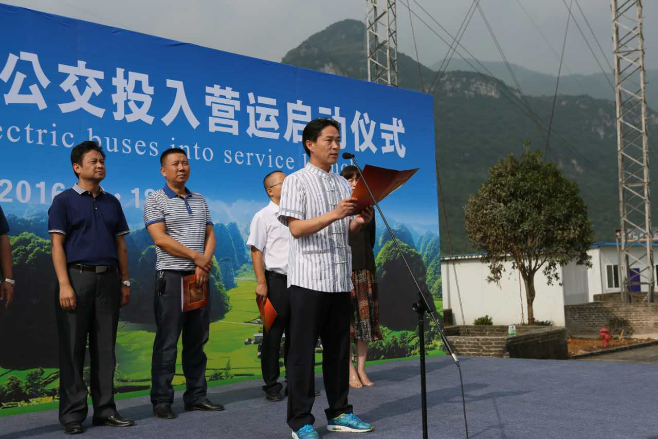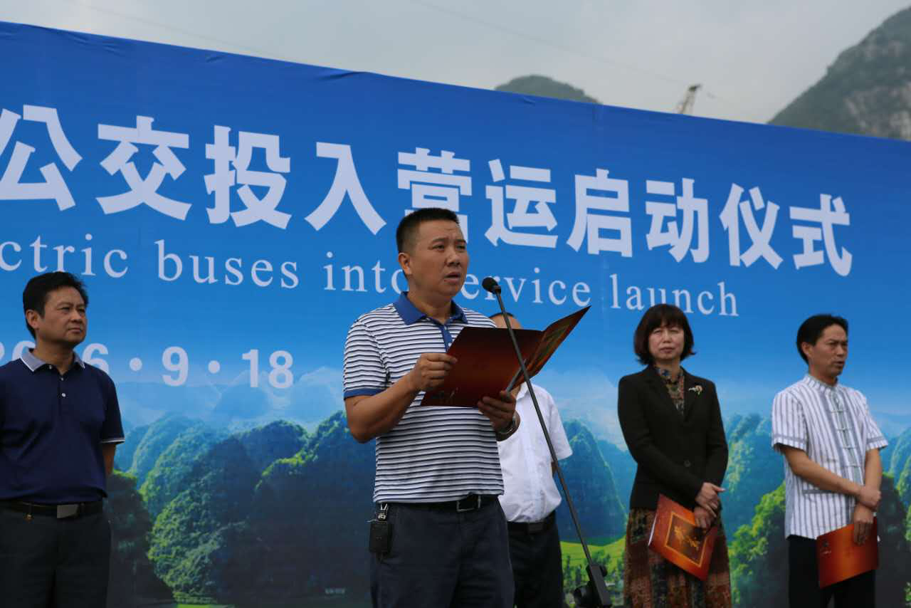 9月18日上午,贵州省兴义市新购置的30辆银隆纯电动公交车上线营运启动仪式在兴义市客运北站隆重召开,兴义市政协副主席吴望江、黔西南州道路运输局副局长梁金川、市政府党组成员、政府办主任荀刚,市交通局局长王健、兴义市城市公交公司经理邹毅及珠海广通汽车有限公司销售四部总经理招建英出席了仪式并致辞。