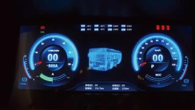 仪表盘的设计极具特色,信息丰富,展示精美。中间还显示着一辆三维立体客车,再搭配上蓝色灯光,仪表盘充满科技感。